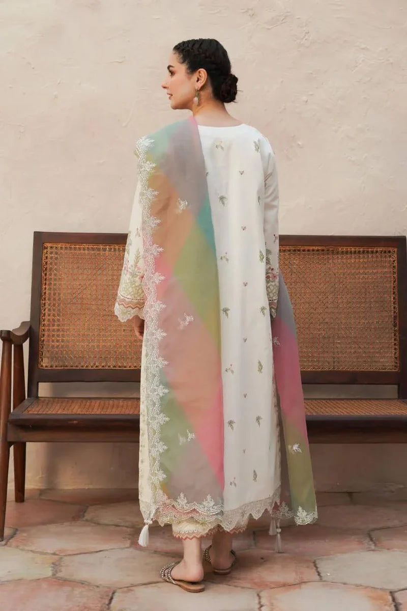 This Villa White is a three-piece stitched lawn suit, which features floral motifs perfectly blended with geometrical cutwork. The ensemble comprises of a lawn shirt, cambric cotton trouser and organza dupatta. Adorned with intricate thread work, the dress promises to elevate your style effortlessly, while the wide-leg trousers and scalloped border dupatta add a touch of grace.